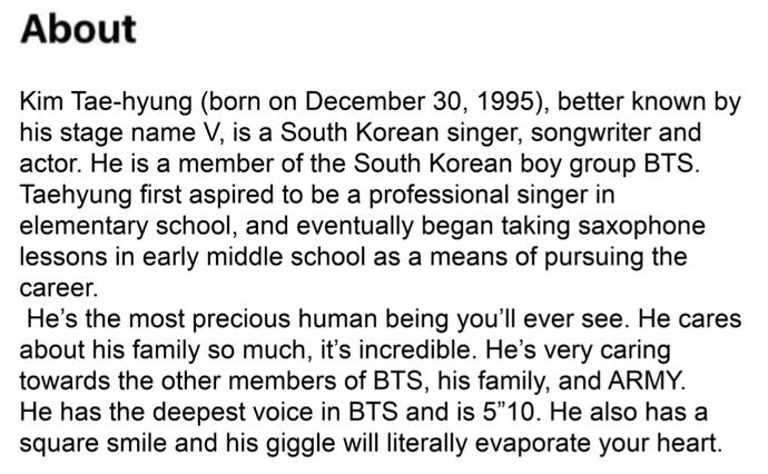 it may sounds insane but Iβd never be the person that i am today without you you really are something taehyung and you mean a lot to bunch of people. you juste are... that powerful, that kind, that precious you really are the type of person who deserves to be protected. you are the type of person that no one can explain (does that make any sense...)